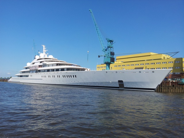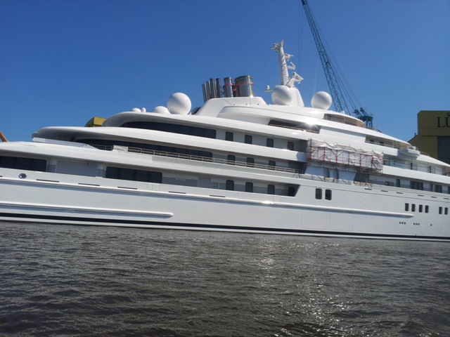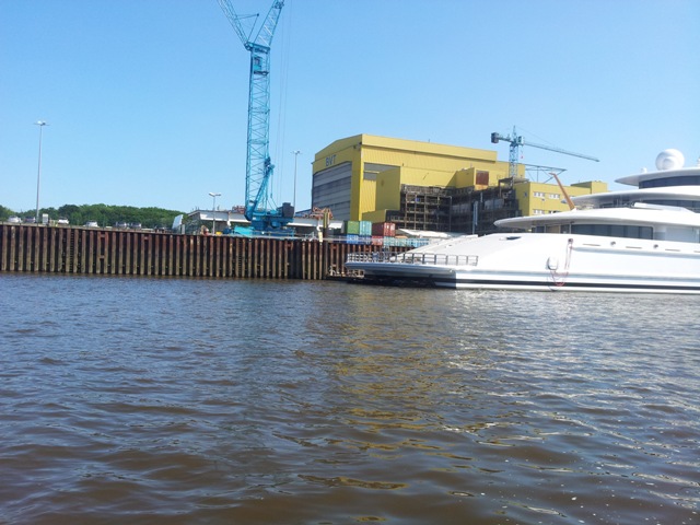 Wir hatten ja im letzen Jahr schon ein Bild von der Yacht im Dock/Werfthelgen von Lürssen Bremen bei unseren Törn nach Bremerhaven gezeigt nun ist das Teil im Wasser.
