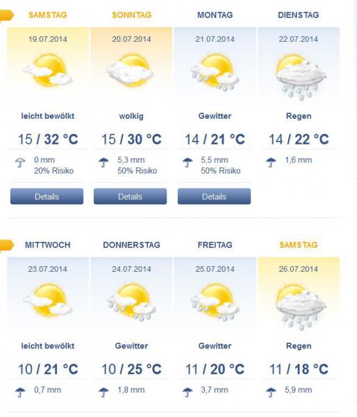 ![]() Bis Donnerstag soll es hier schön bleiben und dann kommt Kälte und Regen. ![]() Für Bamberg siehts besser aus, da regnets angeblich erst später und es wird nicht so kalt. ![]()